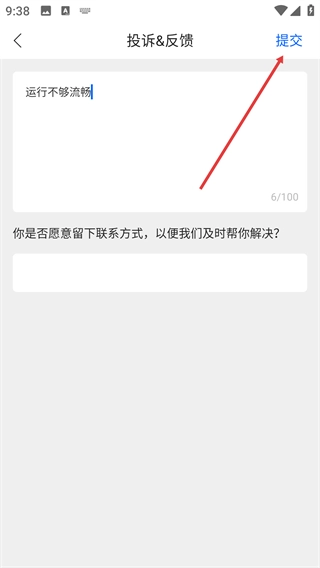 4、在确认“运行不够流畅”这类反馈内容已填写完毕后,点击页面右上角的【提交】按钮,即可完成整个反馈流程。