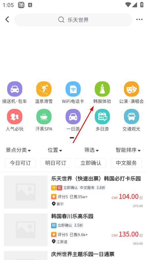 2. 在景点门票分类界面,点击韩服体验选项,即可进入韩服体验项目列表界面。