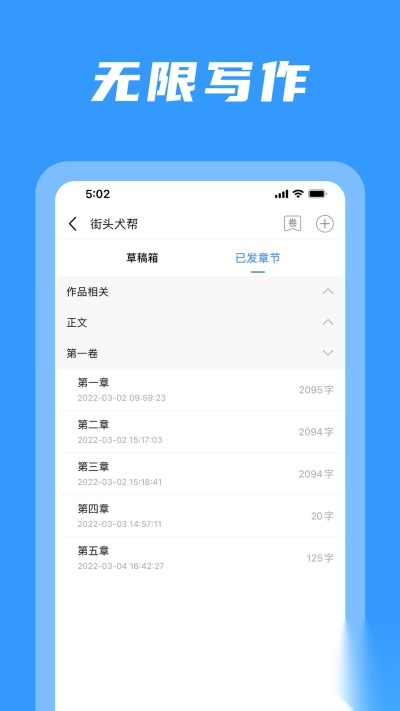 1、小说创作系统:一键创建作品,支持章节管理、分卷设置、草稿保存等功能。