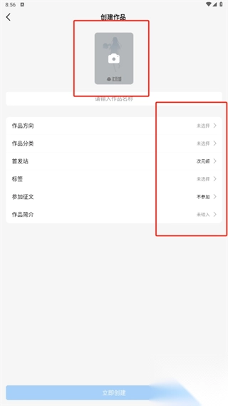 2、输入作品名称、简介、分类等基本信息,点击“创建”;
