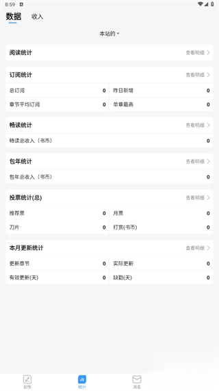 6、可在“统计”中查看作品阅读量、收藏、打赏和收入情况。