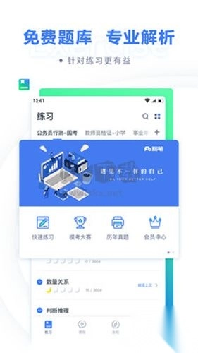 3种个性化出题方式:依据目标考试的考点、考频以及难度,进行智能出题;同时记录用户练习状况,生成数据报告,并对考分作出预测。
