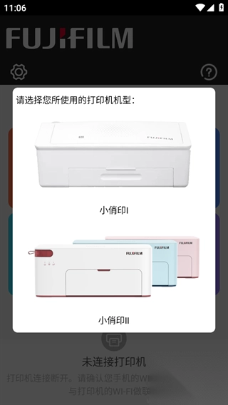 1、于本站下载并安装富士打印app,安装完成后打开该应用,此时会弹出打印机选择界面,按照打印机型号进行选择。在此过程中,需开启手机的WI-FI功能,并使手机与打印机成功联机。