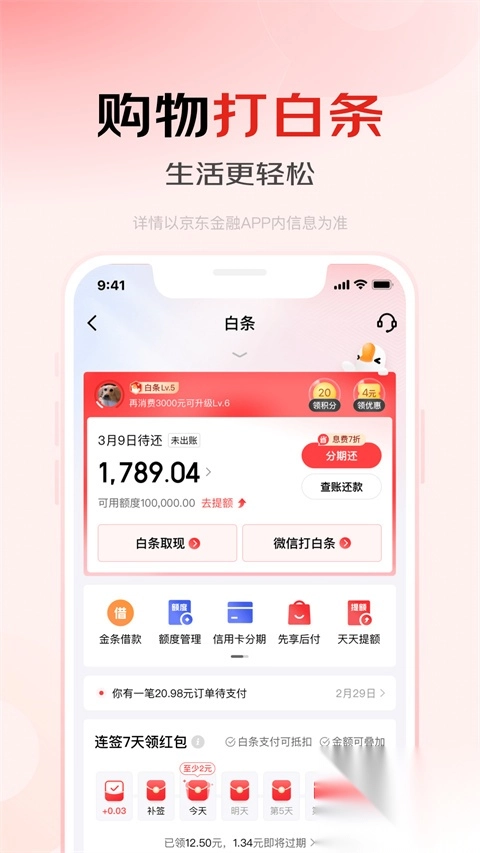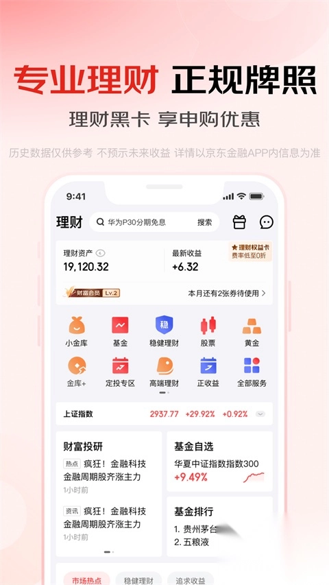 京东金融App,每天为你的生活加一点温度——在这里,您可以轻松解决和“钱”相关的问题:【安心赚钱】【任性花钱】【轻松借钱】【支付省钱】【畅快谈钱】,更有小白理财、保险、日历、早起打卡等贴心服务。