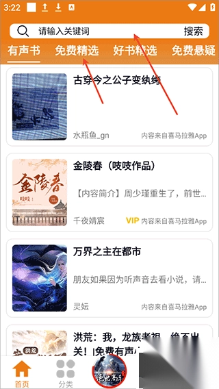 2、在首页的搜索框输入关键词、或者通过分类栏浏览、能迅速找到你喜欢的小说、相声、音乐等各类音频内容