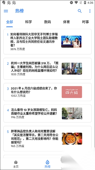 5、点击底部的“热榜”选项,在“全部”分类里,能看到当前最火的话题,涵盖科技、体育、教育、时政等多个领域。