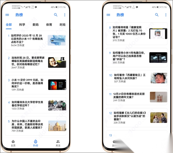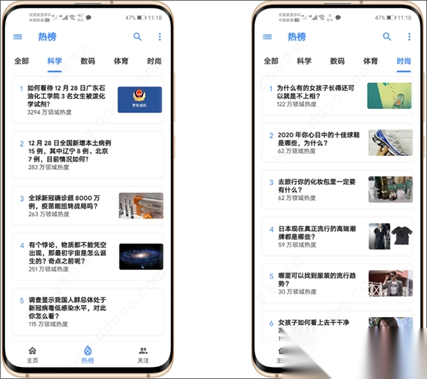 6、除了热榜,还有科学、数码、体育、时尚等分类,内容多样,总能找到喜欢的。