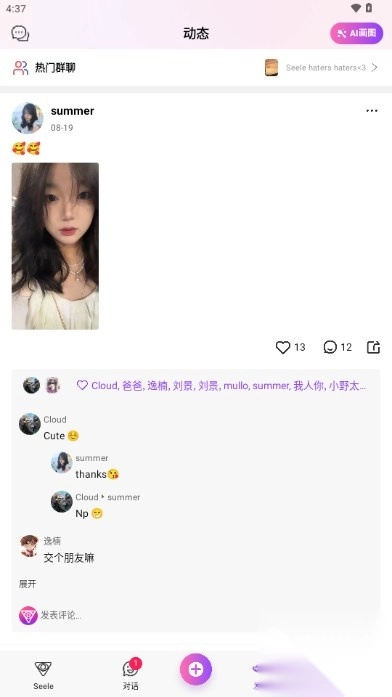 SeeleAI聊天软件的最新版本,是一款极具信赖度的聊天工具。在这款软件中,用户能够毫无顾虑地与家人、朋友畅快聊天,无需担忧信息被盗取或泄露,因为软件配备了先进的防盗技术,从无信息被盗取的情况发生。用户还可以在软件内分享自己的日常生活,只需轻松一拍,就能发布到动态区域,让家人和朋友们都能看到。赶快点击下载,体验这款软件吧!