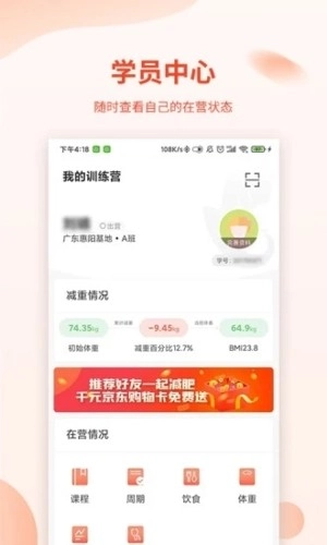 可以通过登录进入到学员平台,查看到自己的所有信息,入营出营,体重变化,日常情况,课程饮食,还可以看自己减重的测试指标的变化等。
