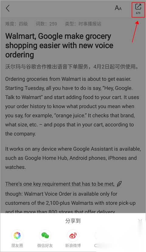 1、在文章界面点击右上角的“分享”图标,即可分享到其他的平台进行查看哦。