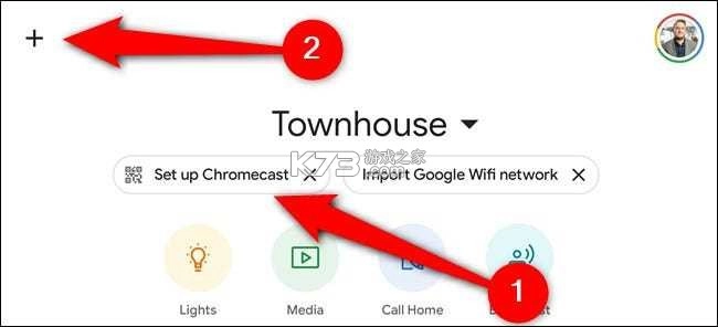 您的设备应该会自动检测 Chromecast (1)。点击“设置 Chromecast”按钮。如果没有,请点击左上角的“+”图标。