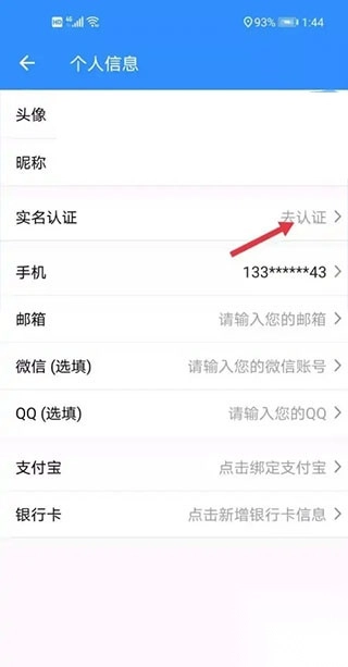 3、选择实名认证,点击“去认证”,进行身份认证。