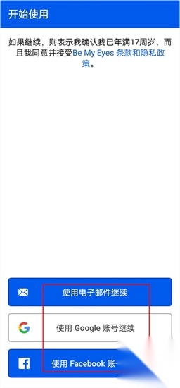 1、开启从本站下载的bemyeyes中国官方版本,挑选登录方式,其中涵盖:电子邮件、Google、Facebook 。