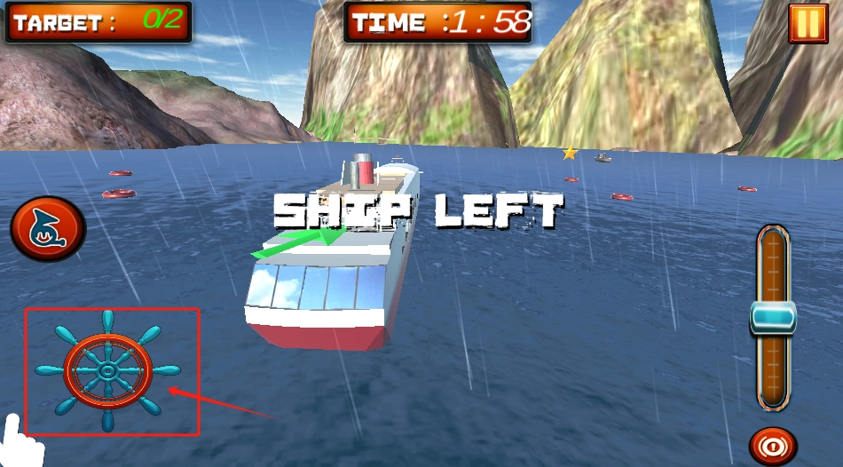 2、驾驶界面,用左下角转向图标控制船方向,在规定时间内完成目标02任务。