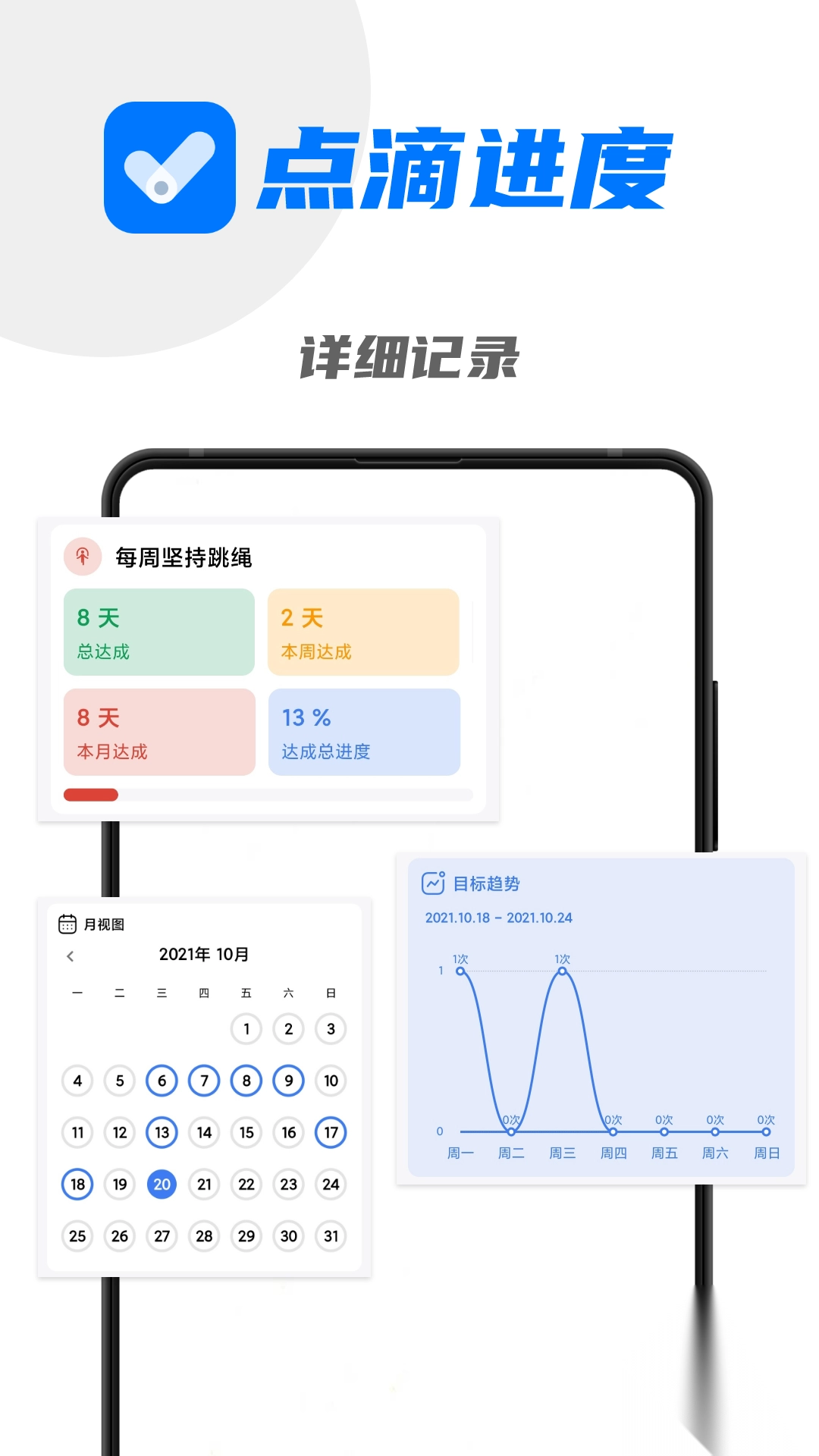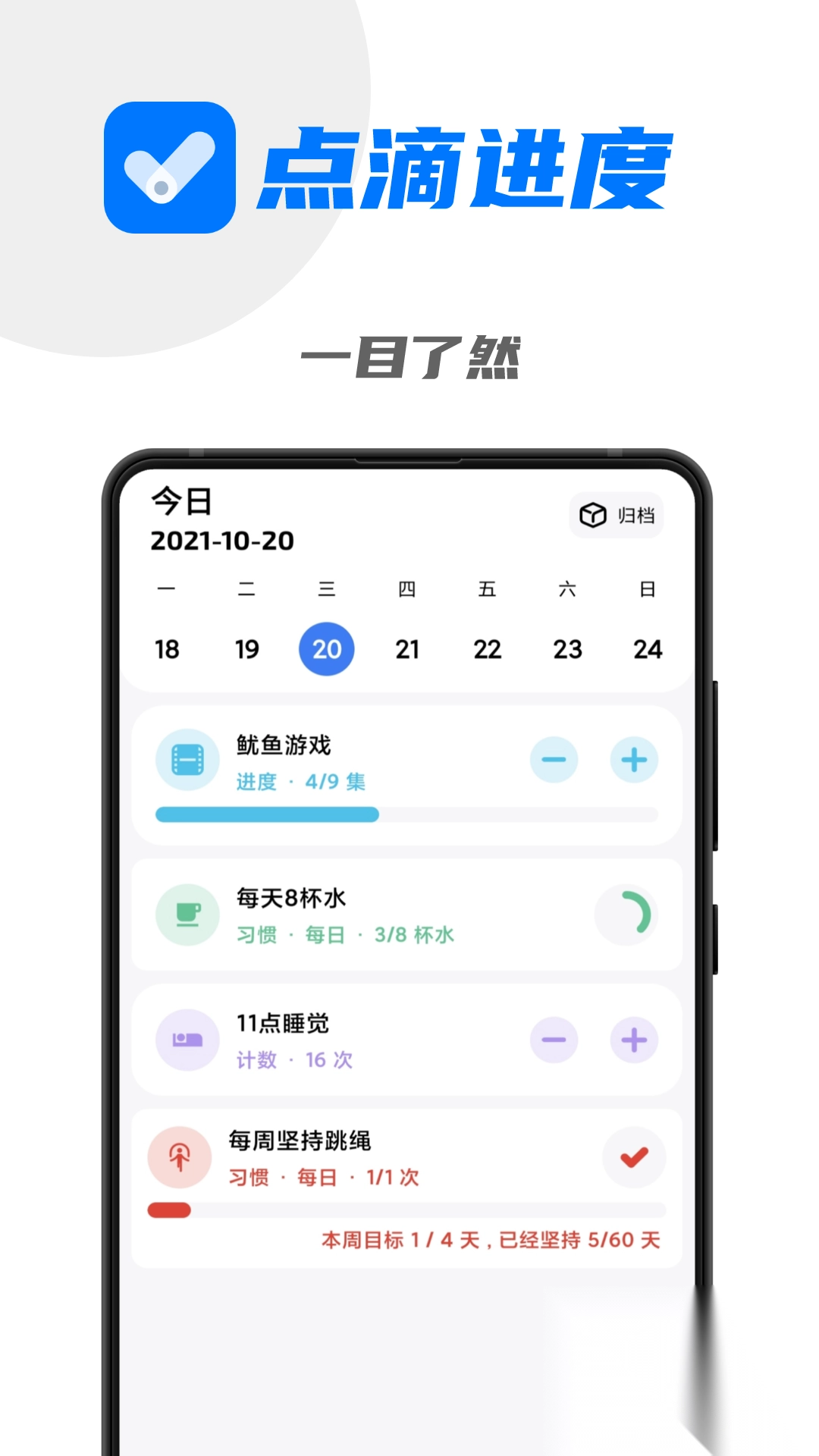 点滴进度最新版是一款手机软件,能让你随手记录各类待办事项,从而追踪每天事件的完成进度。这款软件使用方法简便,可便捷地管理事项完成进度。它支持多种模式操作,能满足不同场景的使用需求,随意切换。软件的使用界面将所有记录功能都清晰展示,只需一键点击想使用的功能,就能立刻开启。此外,还为用户免费提供更多个性化记录功能。