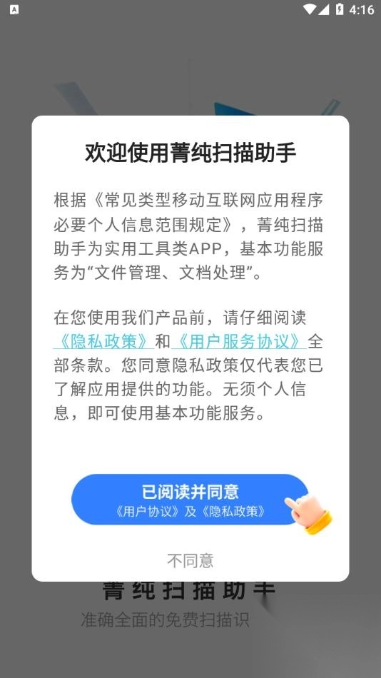 1. 下载并安装软件,安装完成后打开,点击同意用户隐私协议。