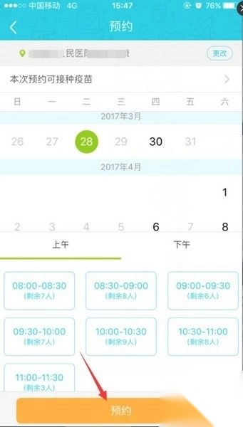 6、完善预约日期和时间段,点击“预约”即可完成预约(如下图所示)。