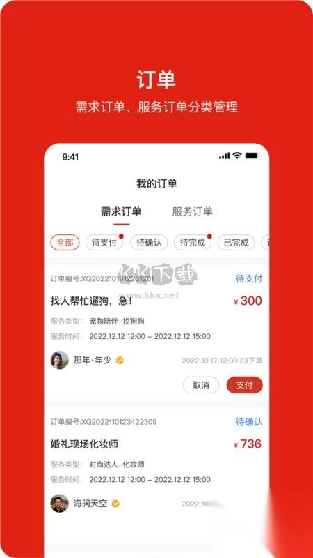 我的订单:不管是服务订单还是需求订单都能够在我的订单页面管理。