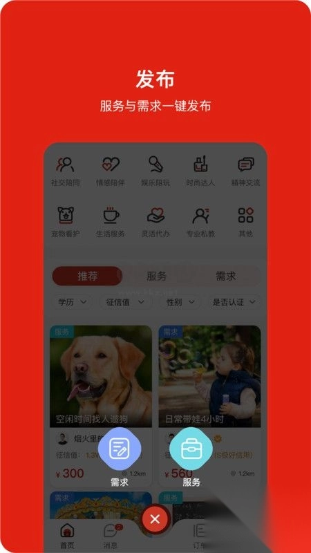 5、可依据自身兴趣、特长及优势,发布各类特长服务,诸如宠物喂养、摄影、穿搭指导、就医陪护等,且不限于这些。