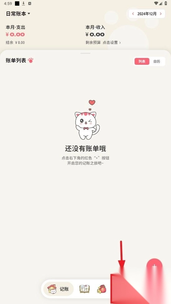 1. 开启喵钱记账安卓版本,轻点下方的猫咪图标,即可进入个人中心。