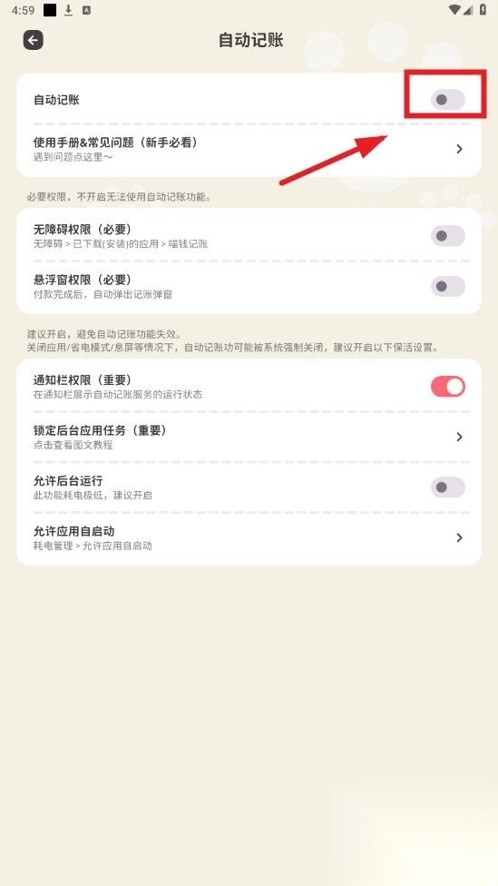 3、找到自动记账功能,点击开启该功能。