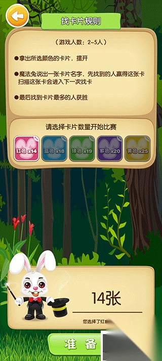 4、寻找卡片,挑选相同颜色的魔法卡并点击准备,此时魔法兔会说出其中一张魔法卡的名字,扫描对应的那张魔法卡就能顺利过关。