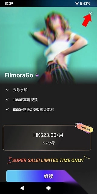 1. 于kk下载站下载并开启Filmora最新版本,待出现下方界面时,点击右上角的“x”按钮,关闭订阅付费界面。