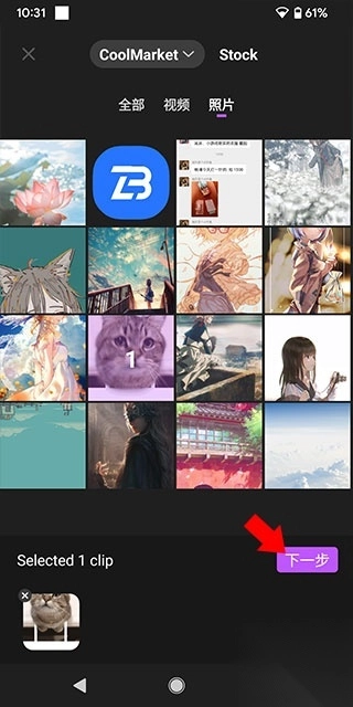 3.打开相册,选择要编辑的视频或照片文件,点击“下一步”。