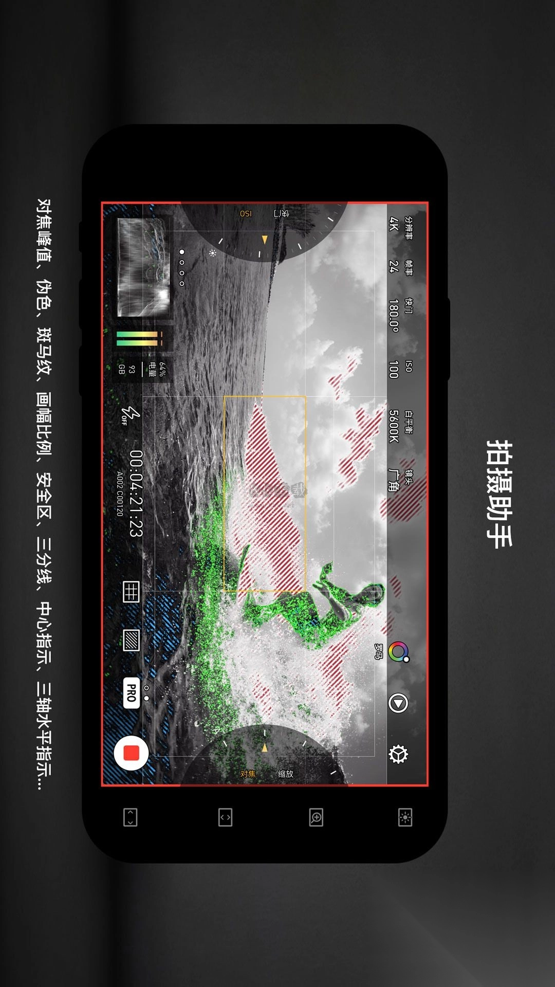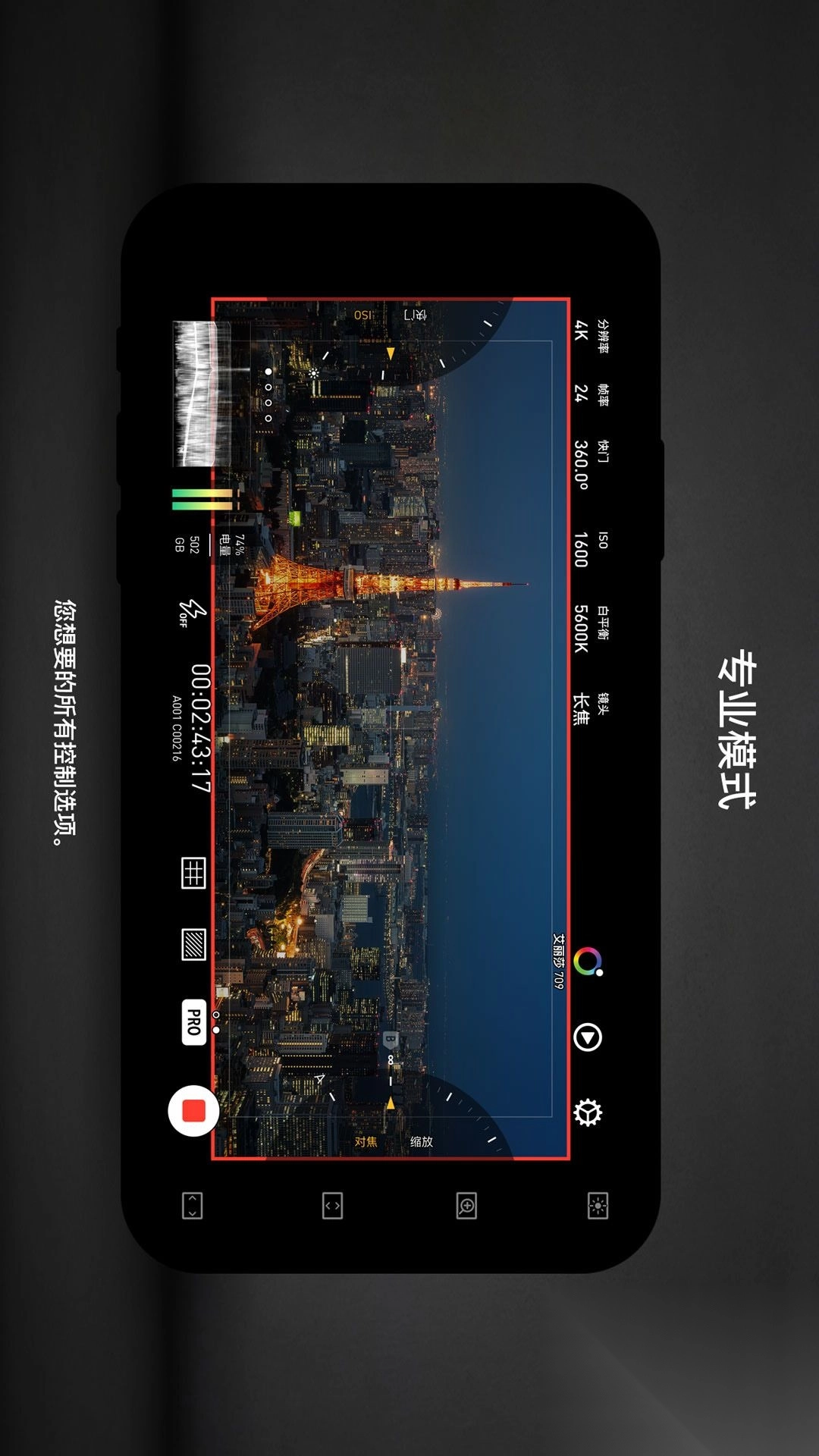 2、PRO专业模式:此模式专为专业视频拍摄者打造。涵盖所有相机数据以及控制按钮