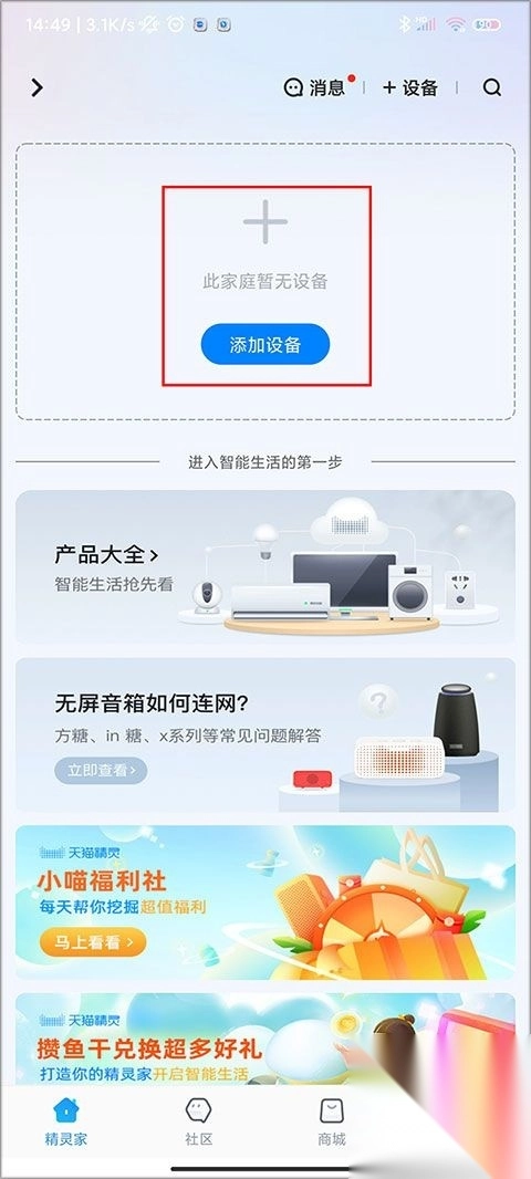 1、首先在本站下载天猫精灵 app 并打开,进入精灵家页面后,点击页面上醒目的添加设备选项。