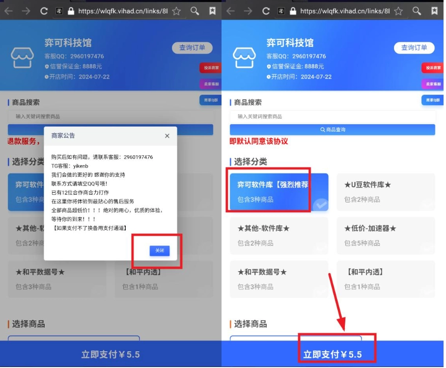 4. 选择商品分类,点击下方“立即支付”,支付成功即可获得卡密。