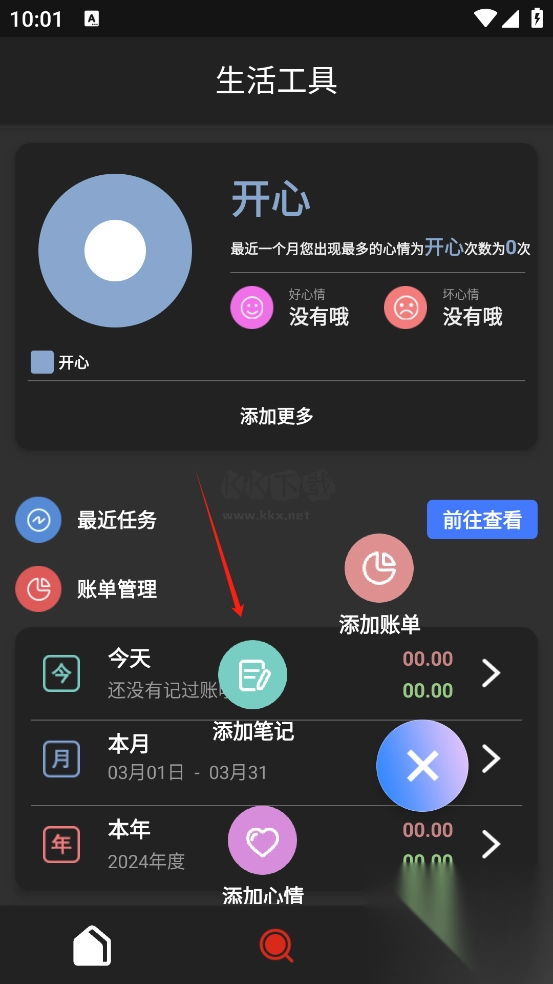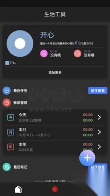 [生活工具]具备添加心情、记录任务与账单,以及添加笔记等功能。