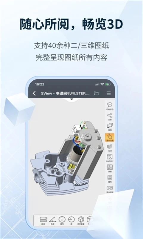 SView看图纸3D是一款三维机械工程模型查看软件。在格式支持方面,SView看图纸手机版涵盖3DXML、IGES、IAM、3DM等多种格式图纸,常用类型基本都能覆盖。查看性能上,这款软件表现十分出色,百兆级数模能流畅旋转、移动和缩放,采用触控式操作,全程基本零卡顿。此外,考虑到部分用户需求,SView看图纸3D还提供批注工具及添加批注内容的服务,避免因没有电脑而致使整个进度停滞的尴尬情况。