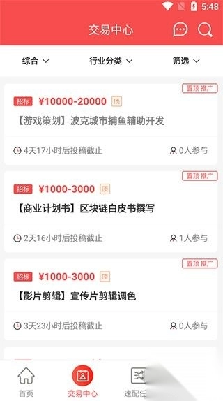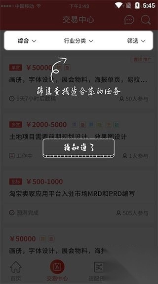 1. 进入软件界面之后,点击交易中心,其中全部是能够接单的任务。