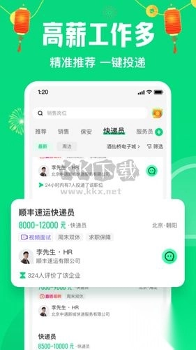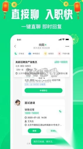 4、聊天找工作:像微信一样,与主管在线聊天,聊爽就上班,一小时就能入职;