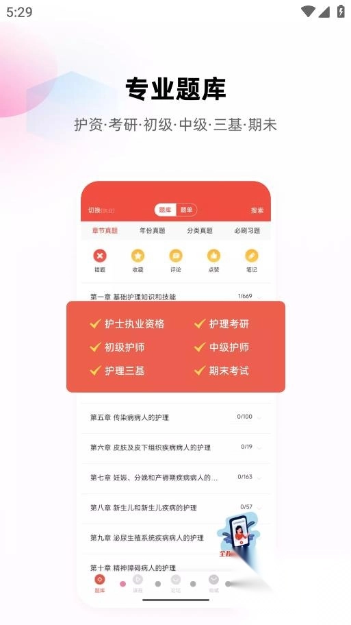 护考帮软件,专为广大护士精心打造的优质备考平台。无论是护士资格证考试,还是护理考研、三基考试、初级护师考试等等,这里都拥有海量题库,覆盖范围极为广泛。每一道题目都配备详细解析,助力你透彻理解知识点,稳稳通过每场考试。有需要的朋友,别再犹豫,赶紧下载体验吧!