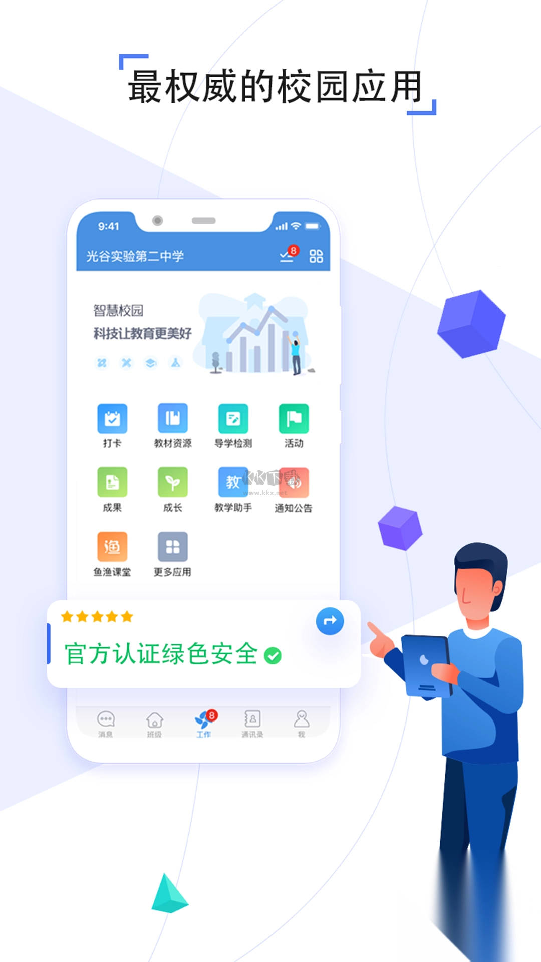 4、多方沟通:教师、家长可快速创建备课组、育儿组等,围绕教学、教育实时交流;还可随时随地进行班级圈分享、互动,孩子在家与校穿梭时的学习和生活状况尽收眼底。