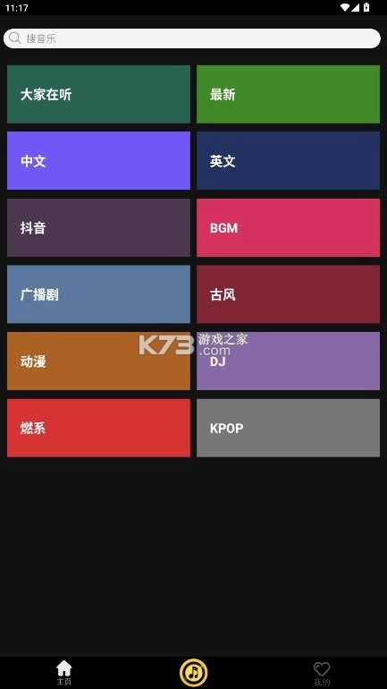2. 主要分为以下几大类,大家可在听、最新、中文、英文、抖音、BGM、广播剧、古风、动漫、DJ、燃系、Kpop 中,任选自己喜爱的类别。