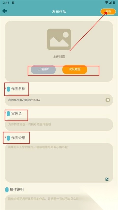 8、完成相关操作后就能够发布,依次填写作品名称、宣传语、介绍,同时上传图片,最后提交。