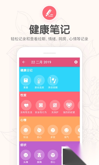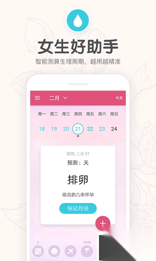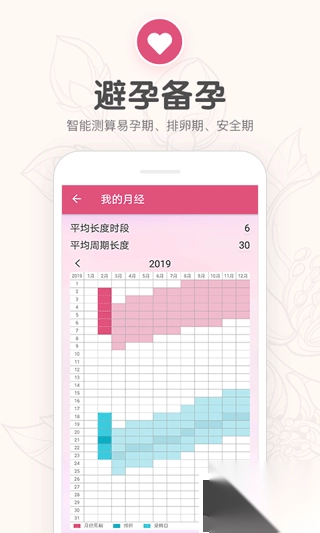 精准预测月经周期,清晰标注受孕窗口期和排卵日,满足避孕/备孕双重需求。