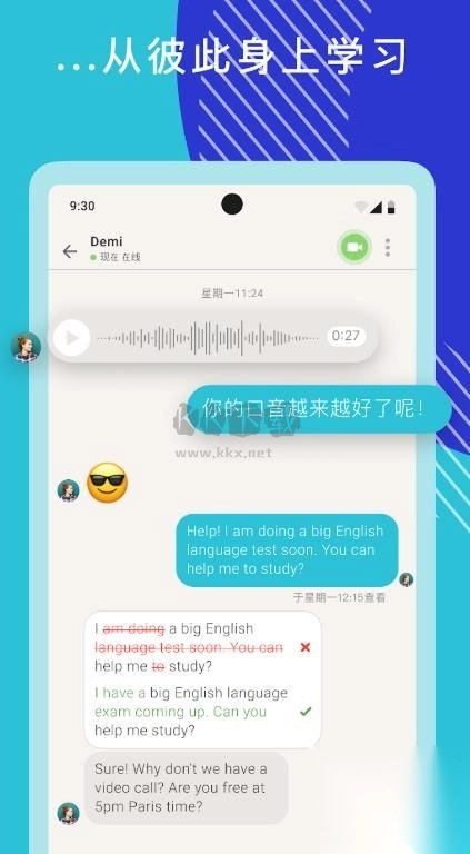 2、无论身在何处,都可和国外朋友一起练习听力,纠正口语发音,让学习的旅程不再孤单。