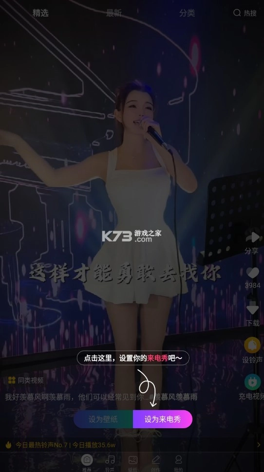 精彩分类,总有一款你喜欢: 提供精彩分类,包括明星、动漫、电影等,用户可以根据个人喜好轻松找到总有一款符合自己心意的来电秀。