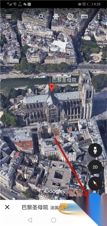 3、举个例子,当我们在搜索框中输入“巴黎圣母院”进行搜索时,便能以空中俯瞰的视角,观察到巴黎圣母院的全貌。