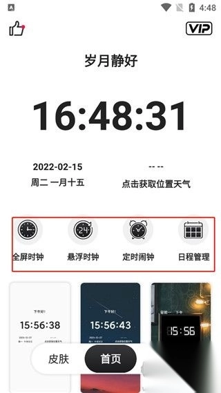 1、打开在本站下载的悬浮时钟app,进入首页,我们可以看到全屏时钟、悬浮时钟、定时闹钟和日程管理功能;