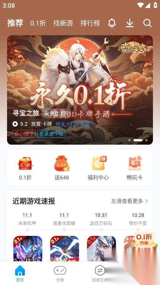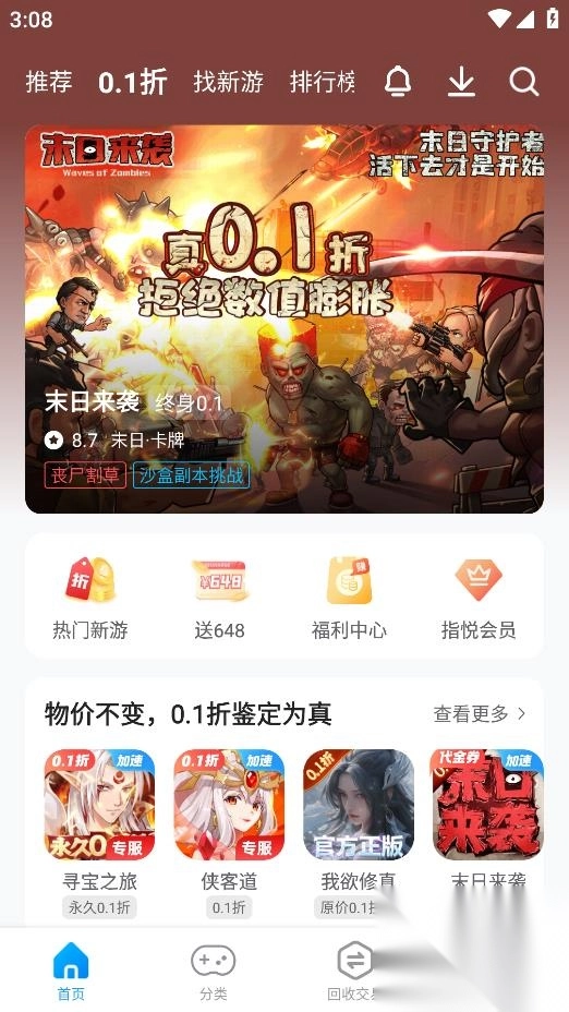 指趣手游盒安卓版APP,堪称低折扣游戏的宝藏盒子。这里游戏资源海量,种类丰富多样,设有0.1折专区与新游专区,将你可能感兴趣的游戏一并打包呈现。不仅如此,各类游戏福利持续派送。平台还支持账号回收交易。喜爱玩游戏的小伙伴们,别再犹豫,赶紧下载体验吧!
