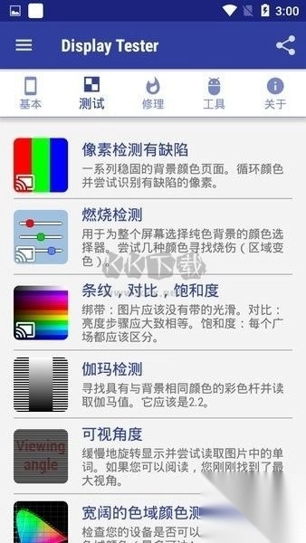 Display Tester汉化版是一款专业的烧屏修复软件。在Display Tester烧屏修复app中,用户能享受到全方位的液晶屏幕测试与修复服务。这款app具备众多功能,比如坏点测试、颜色测试、发光测试等,能让你轻松检测出屏幕问题,使屏幕始终维持最佳使用状态。感兴趣的用户,快来KK下载体验吧!