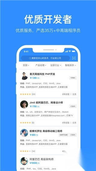 2、按时雇佣BAT级程序员:按需求短期雇佣人才,获得超额回报。企业方与人才直接沟通,使用[雇佣直通车]帮您自动预约合适开发者,为您平均节省一周的预约和沟通等待时间
