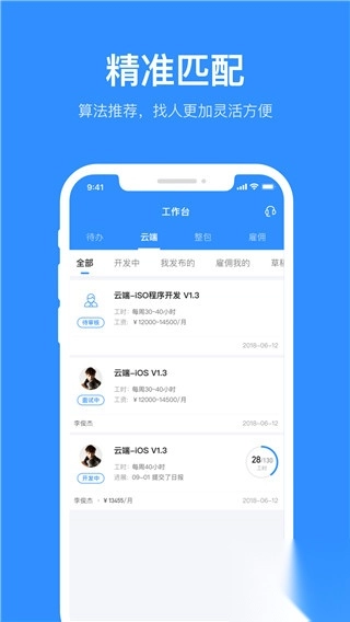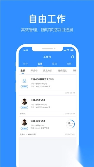 1、一键发布开发项目:专属项目经理合作,快速读懂项目需求,将整个软件系统通过任务形式众包出去,12小时内进入开发,项目成功率97%,成本却只有传统外包一半