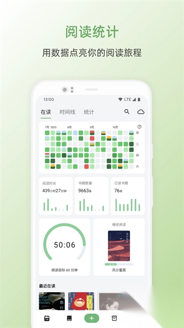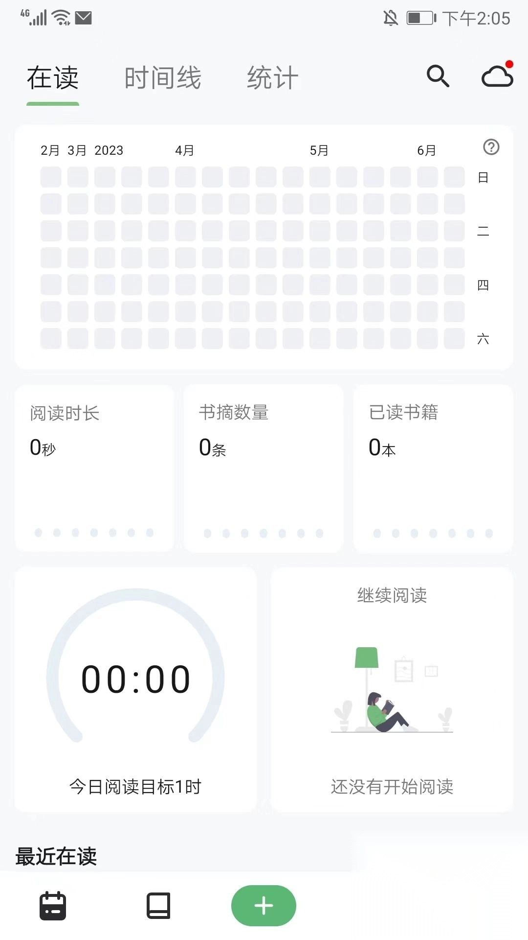 1. 打开纸间书摘官方版,进入日历界面,在此处能够看到当前的阅读时长、书摘数量、已读书籍,还可以进行阅读目标的设定等。