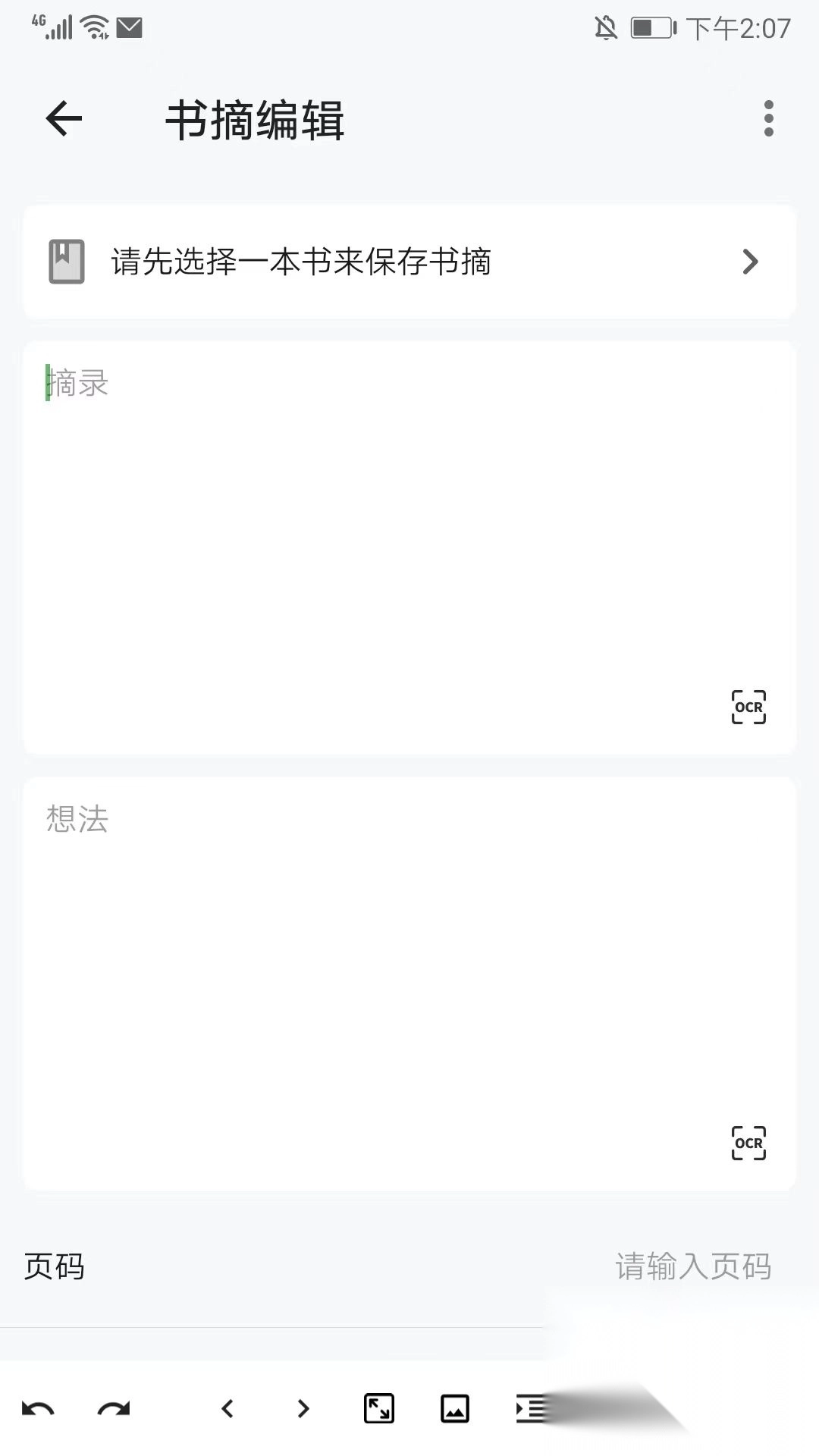 3、在书摘编辑页面,能够挑选对应的书籍,开展相关摘录以及想法的编辑工作。